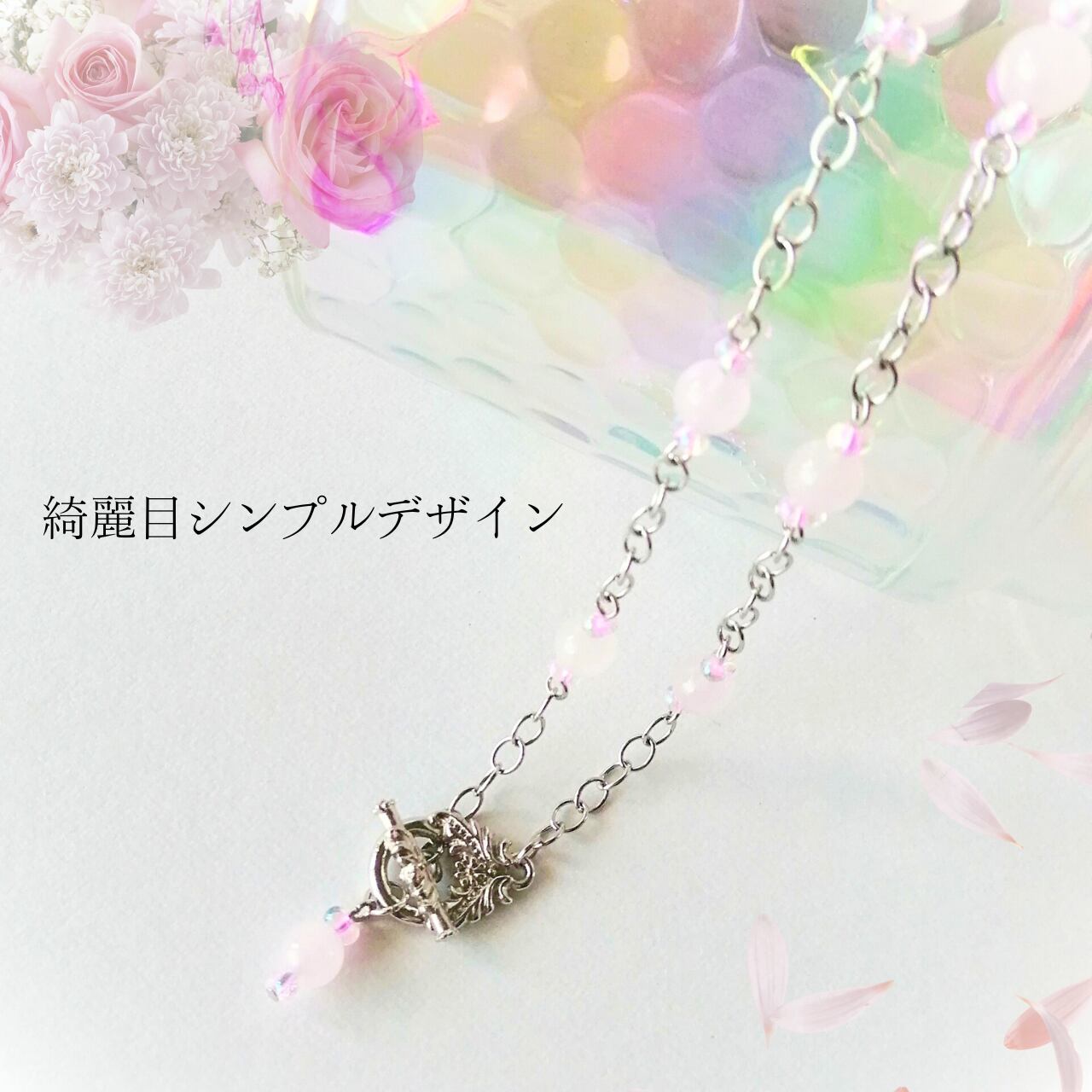 柔らかな色味のローズクォーツとマンテル仕様が特徴的なネックレスです