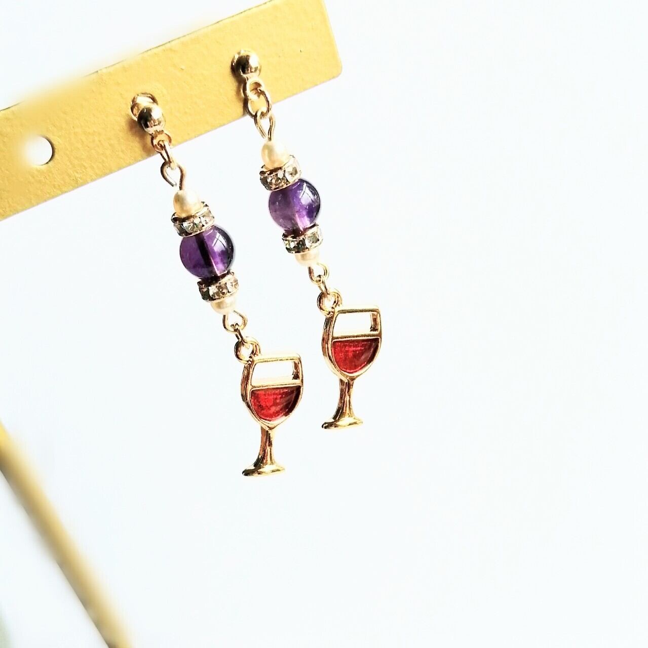 赤ワイングラスチャームの赤とアメジストの紫の融合ピアスは大人のエレガント。