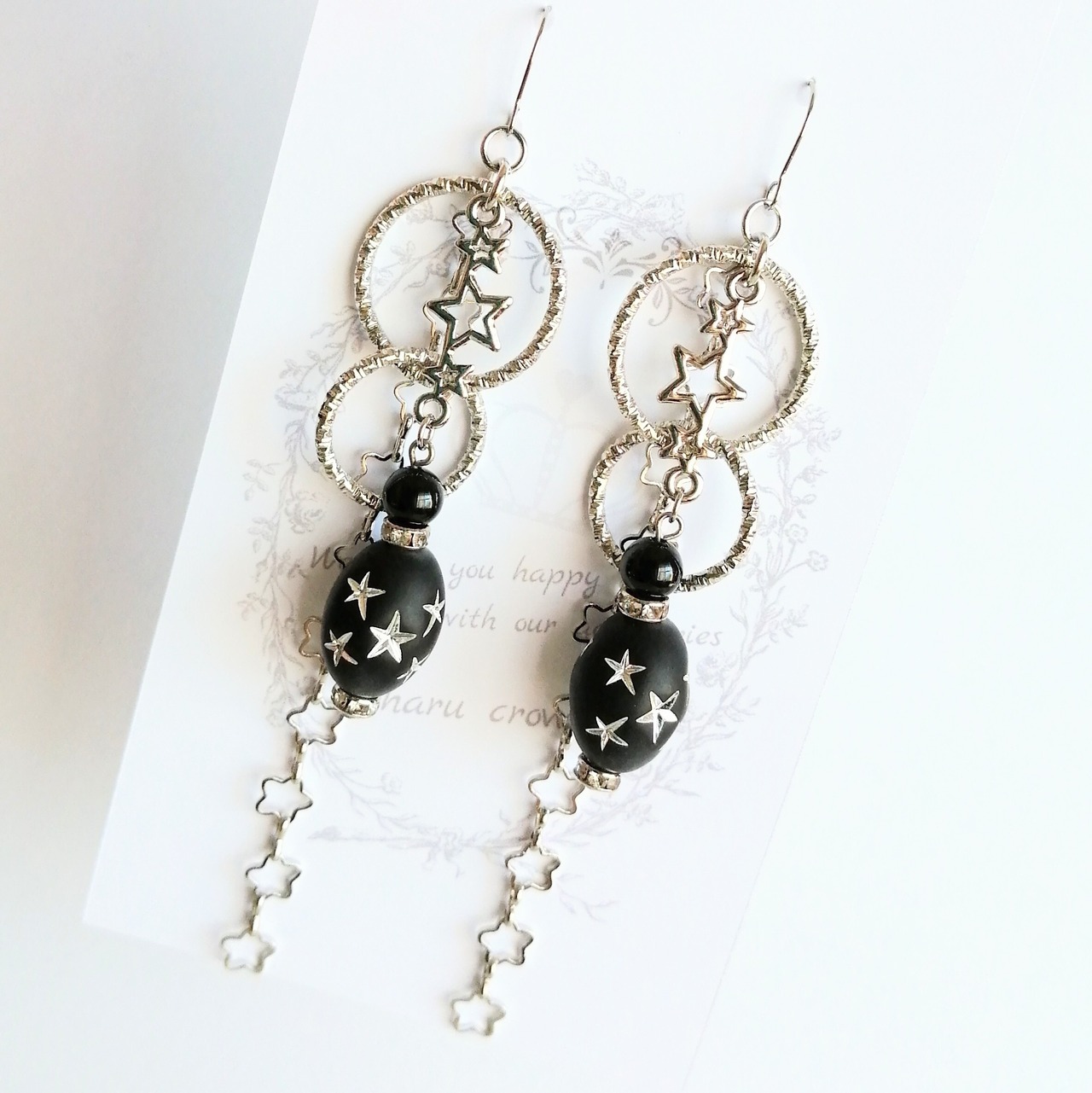 こちらはオニキス6mmとドイツ製スタービーズオーパル、スターラインチャームのピアスの商品ページです。