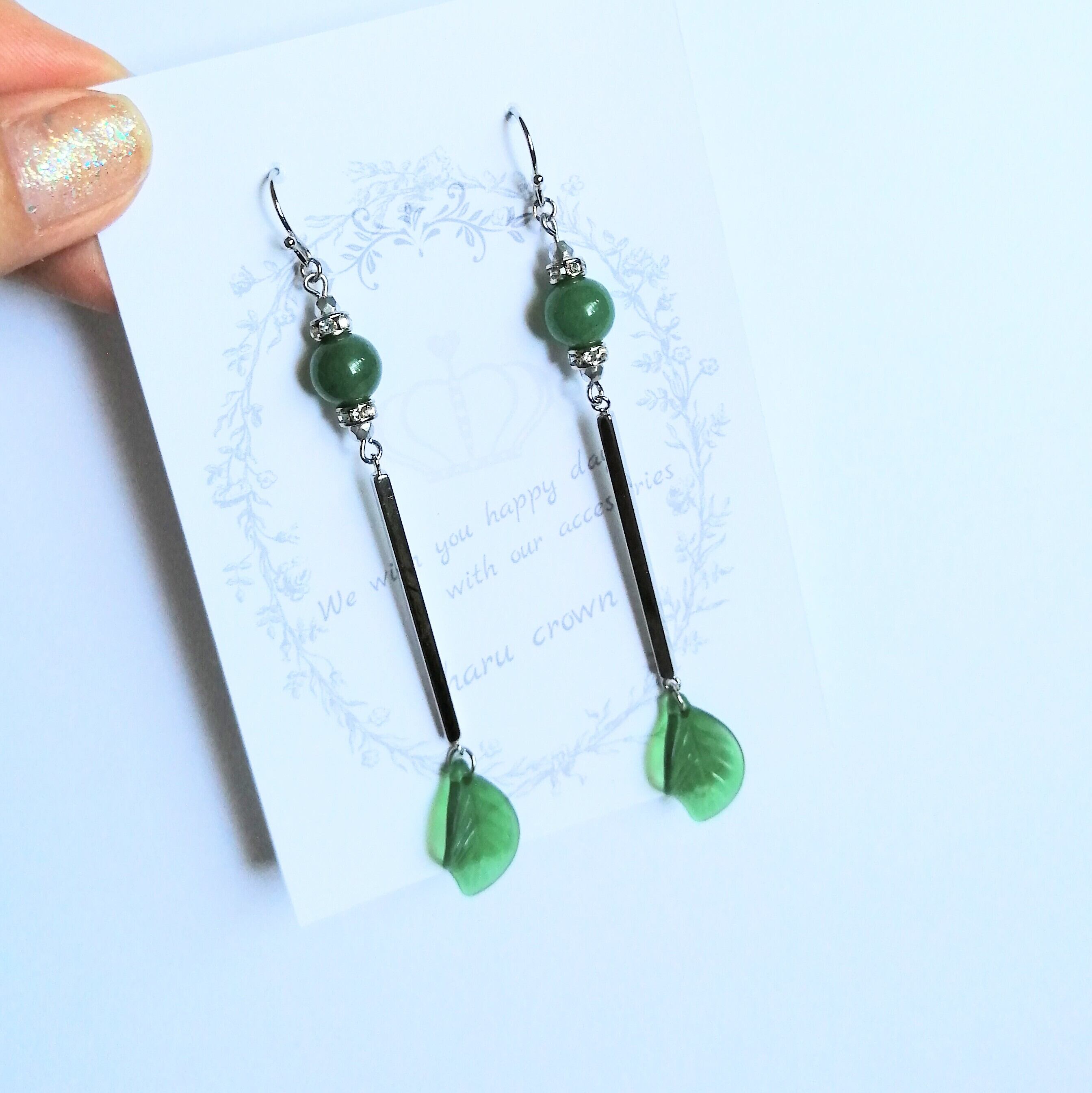 アベンチュリンと(天然石パワーストーン)8mmと葉っぱパーツ、メタル角バーのピアスです。