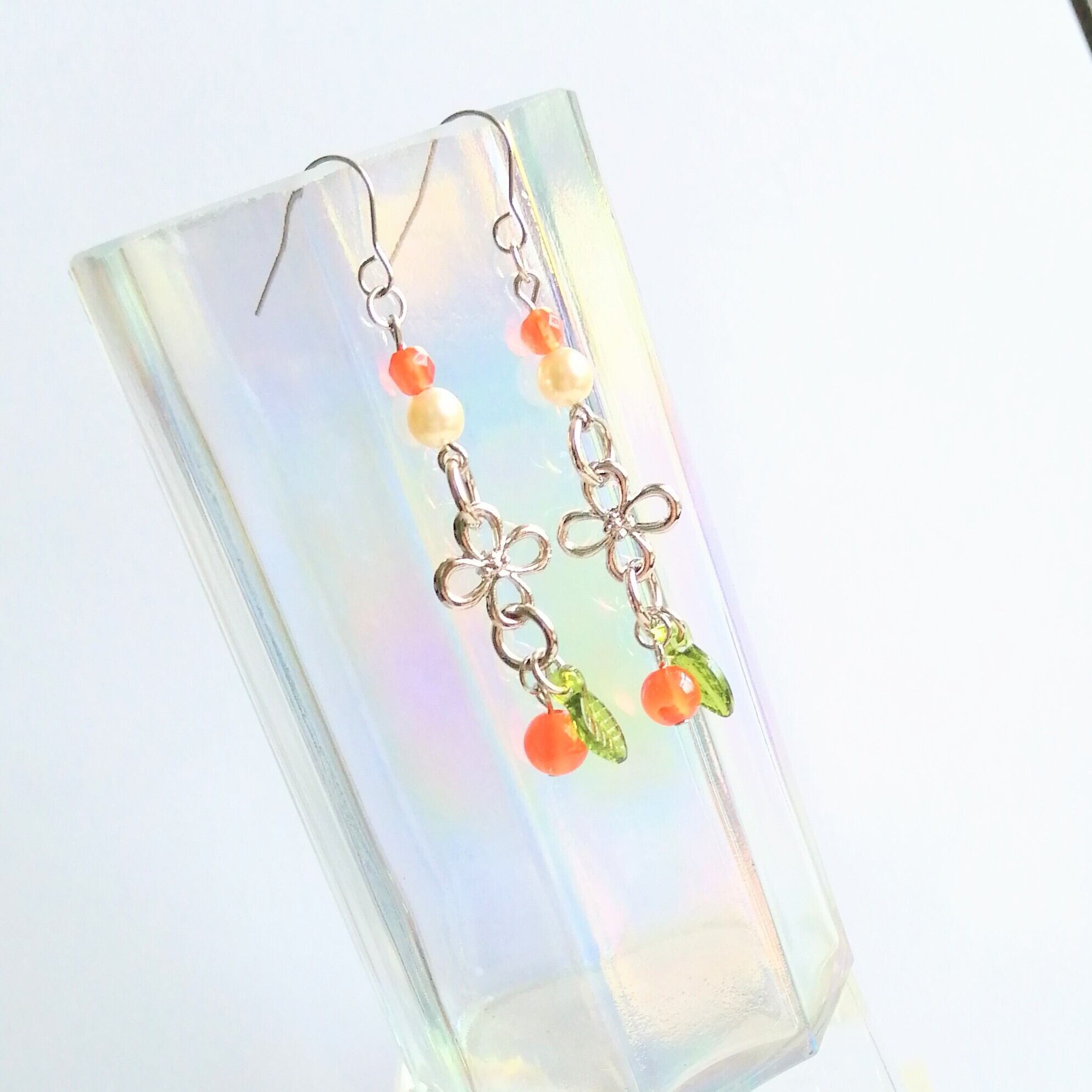 オレンジ色にシルバー、グリーンの組み合わせのピアスです。