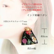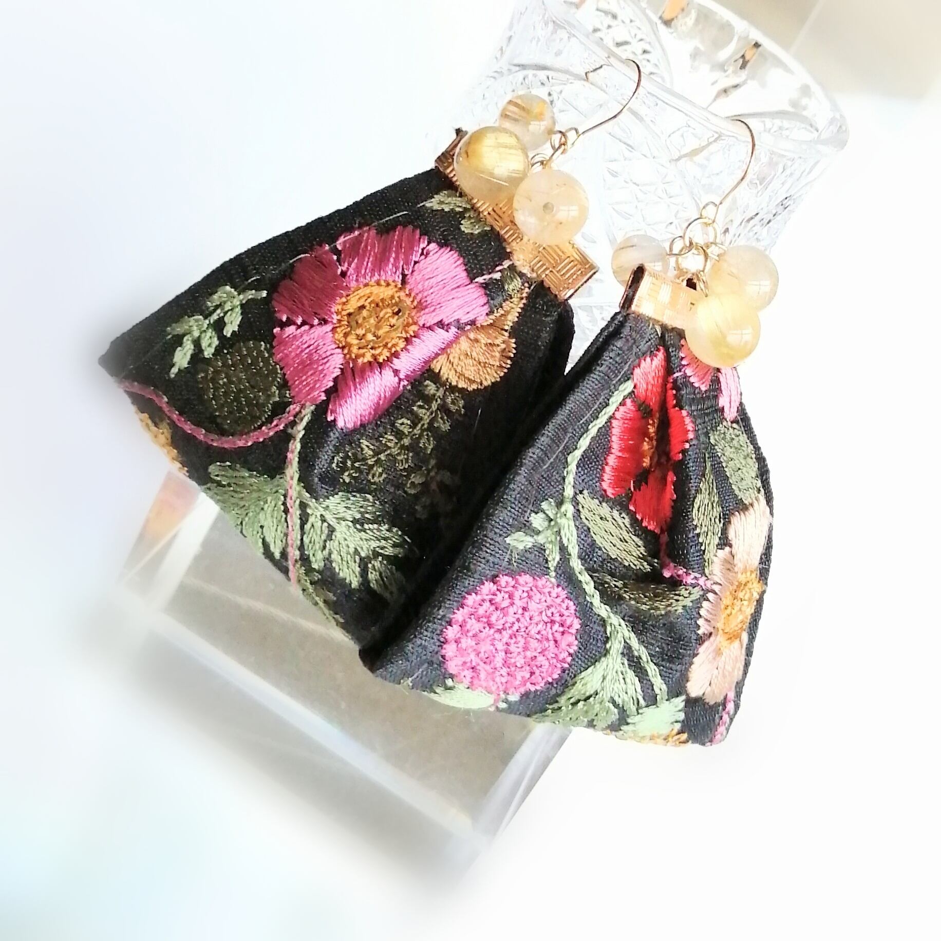 ルチルクォーツとインド刺繡のピアス(イヤリング)黒×赤×ピンク