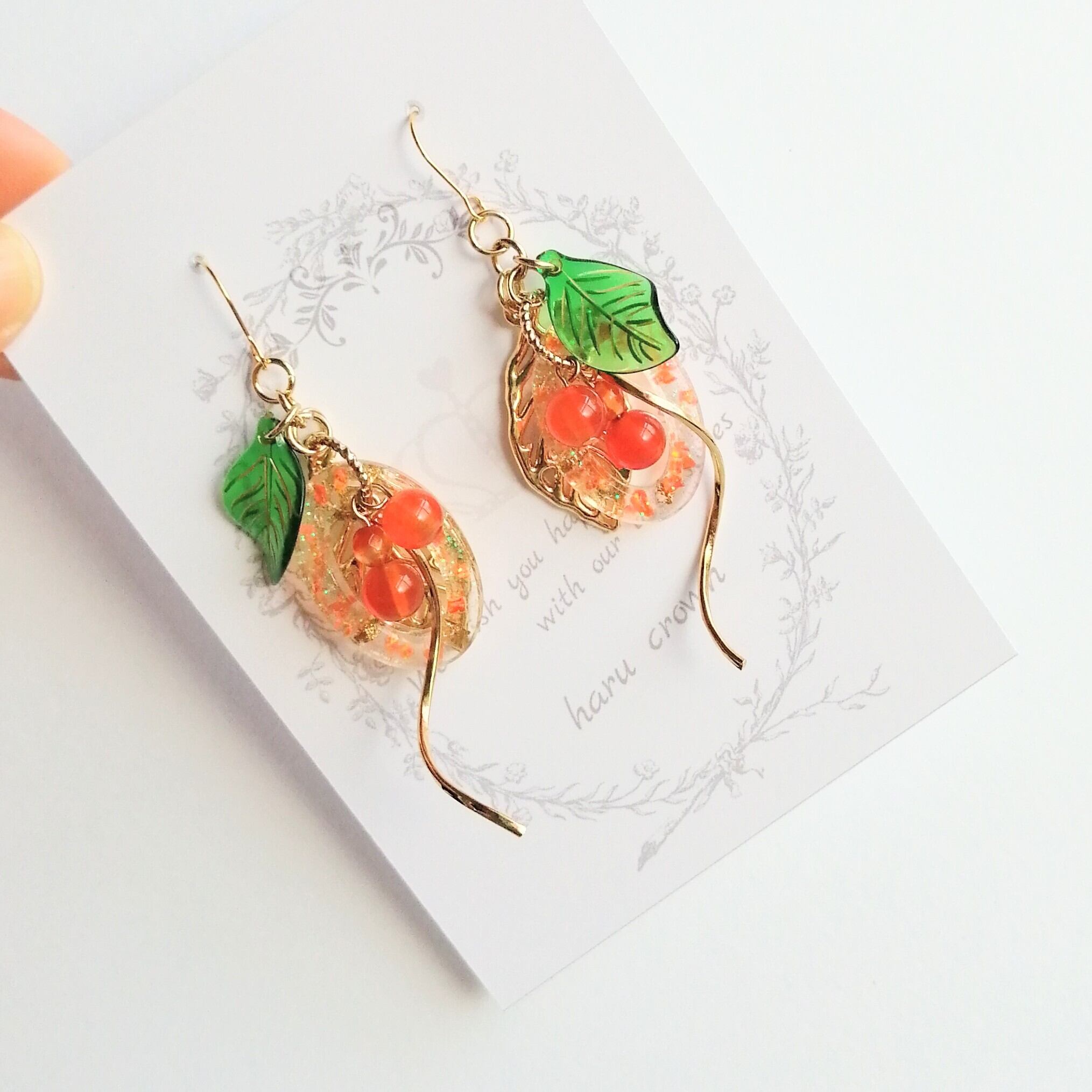 カーネリアンは4mmと6mmを使っています。綺麗なオレンジ色にピッタリのリーフ(ゴールドとグリーン)を合わせてみました。