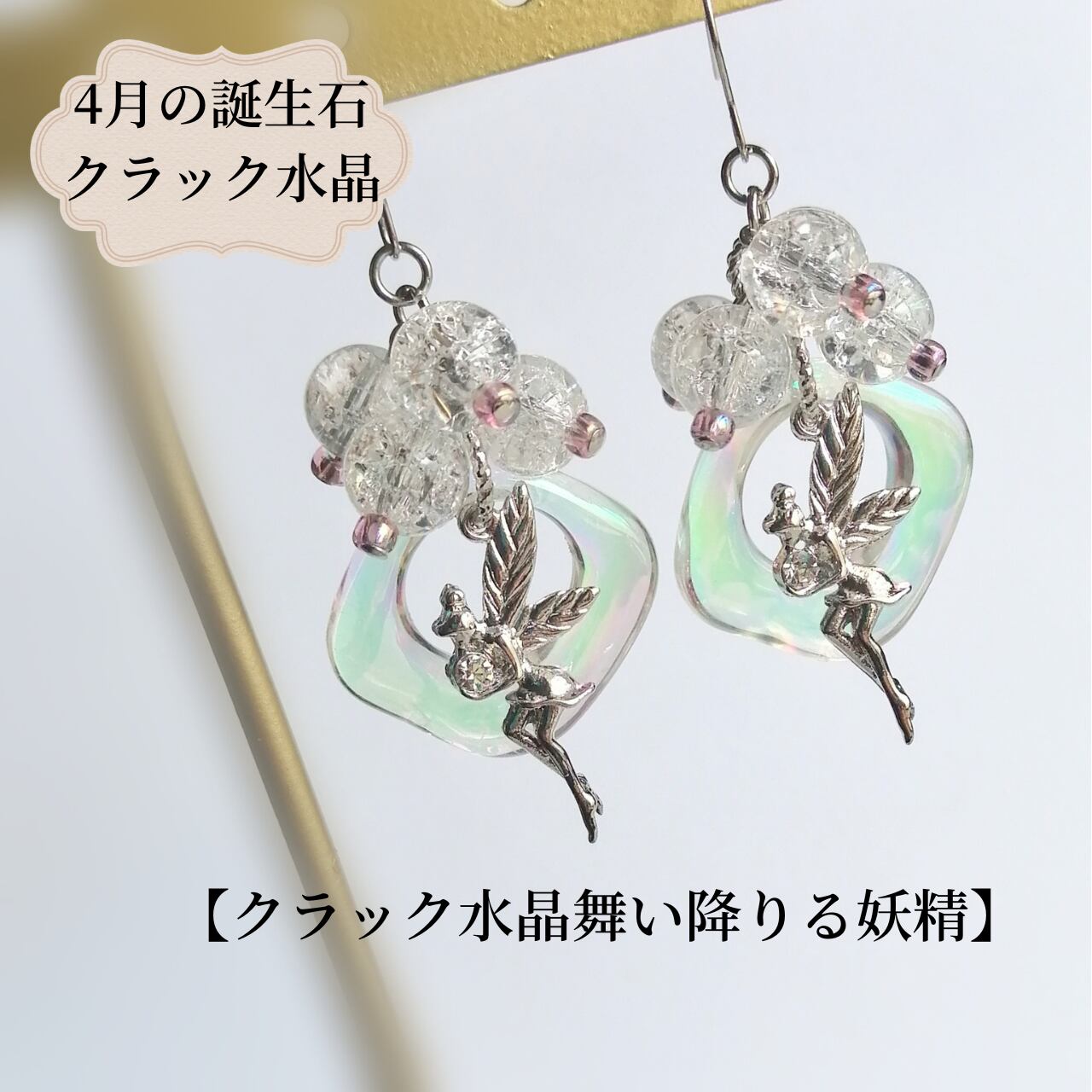 こちらはクラック水晶(天然石パワーストーン)8mmと妖精メタルパーツを使ったピアス(イヤリング)です