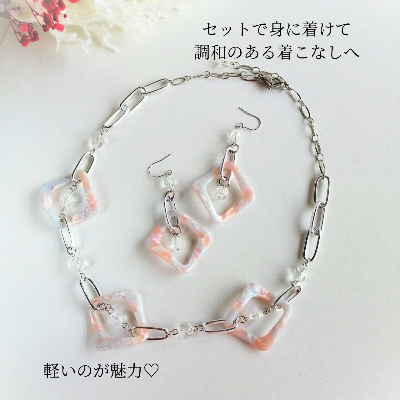 春を感じさせてくれる水晶とクラック水晶使いのネックレス&ピアス(イヤリング)セットです。