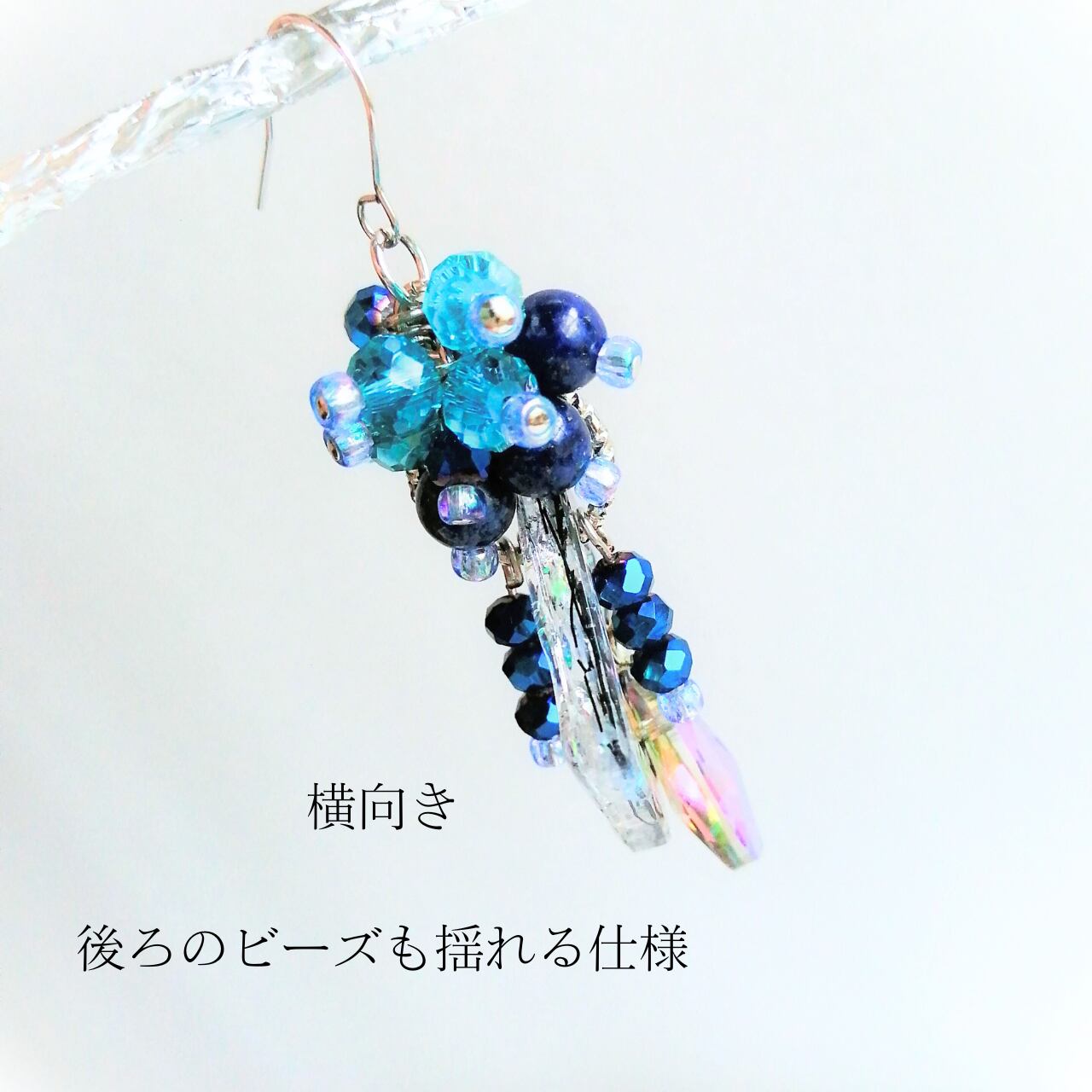 ラピスラズリの美しい輝きとオーロラに輝くしずく型パーツが、まるで宇宙のような輝きを放ちます。