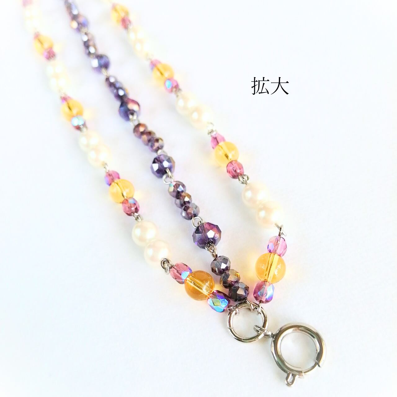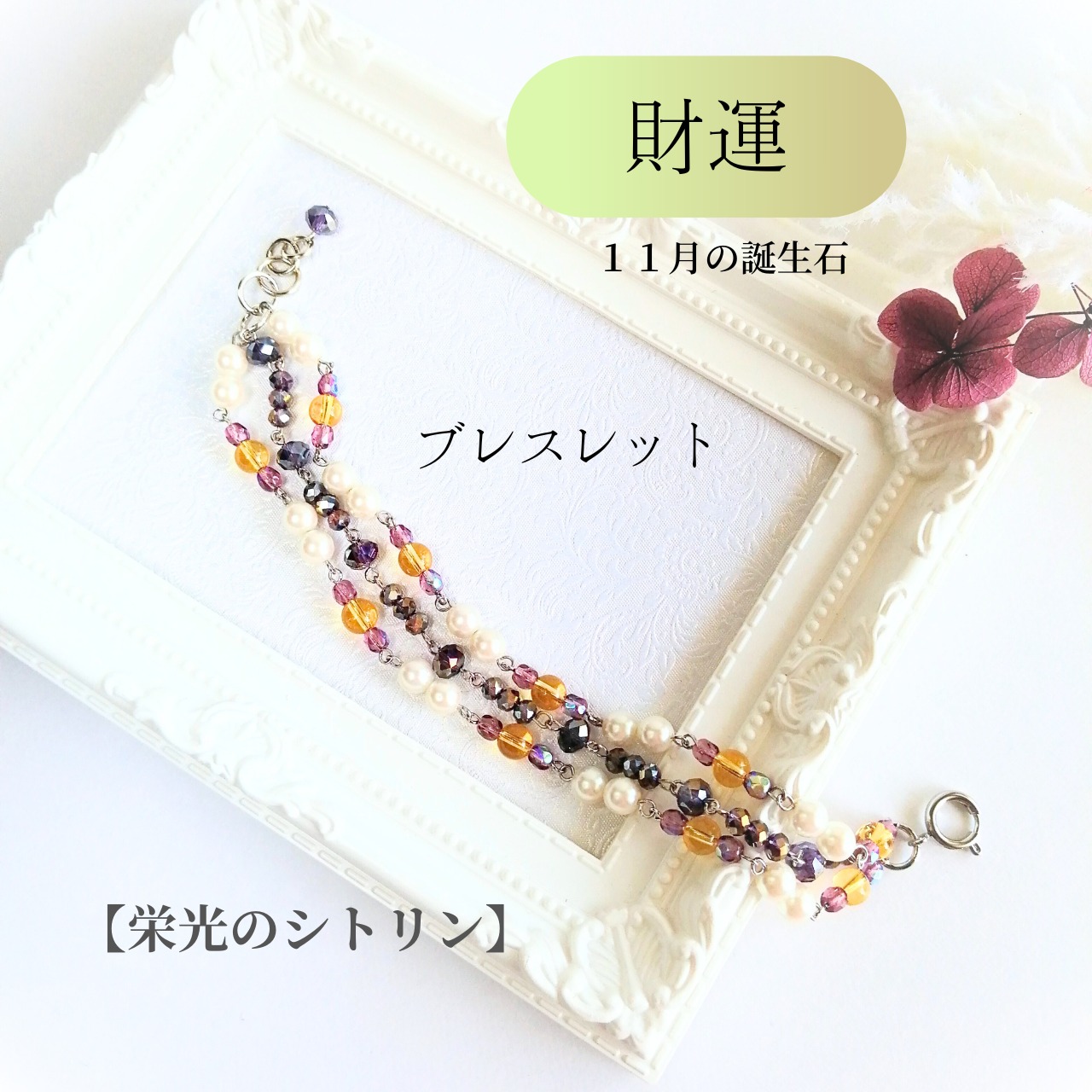 天然石シトリンとパールビーズ、パープルビーズと合わせたことで、エレガントに身に着けられます